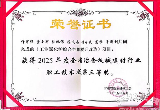 近日,甘肅省冶金機(jī)械工會(huì)表彰獎(jiǎng)勵(lì)了2025年度甘肅省冶金、機(jī)械、建材行業(yè)職工一批職工技術(shù)創(chuàng)新成果。天水鍛壓機(jī)床(集團(tuán))有限公司工會(huì)申報(bào)的《工業(yè)氮化爐綜合性能提升改造》職工技術(shù)創(chuàng)新成果榮獲2025年度全省冶金機(jī)械建材行業(yè)職工技術(shù)成果三等獎(jiǎng)。